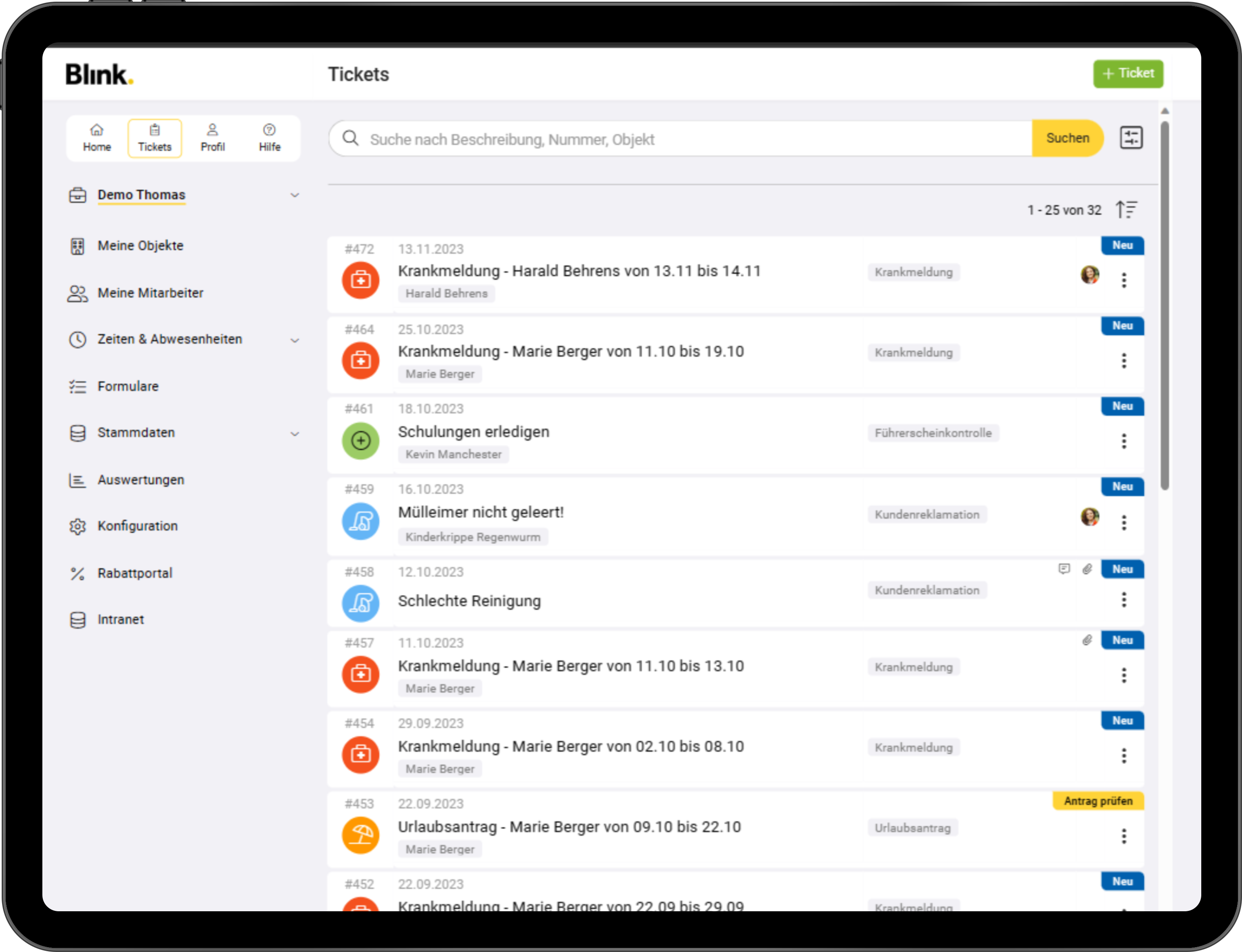 Dabei sind Tickets so in die Blink-Welt eingebunden, dass der Zugriff sowohl für die Objektleitung, Verwaltung und Reinigungskräfte als auch Kunden ermöglicht werden kann. Tickets können in Formulare oder das Kundenportal integriert werden.