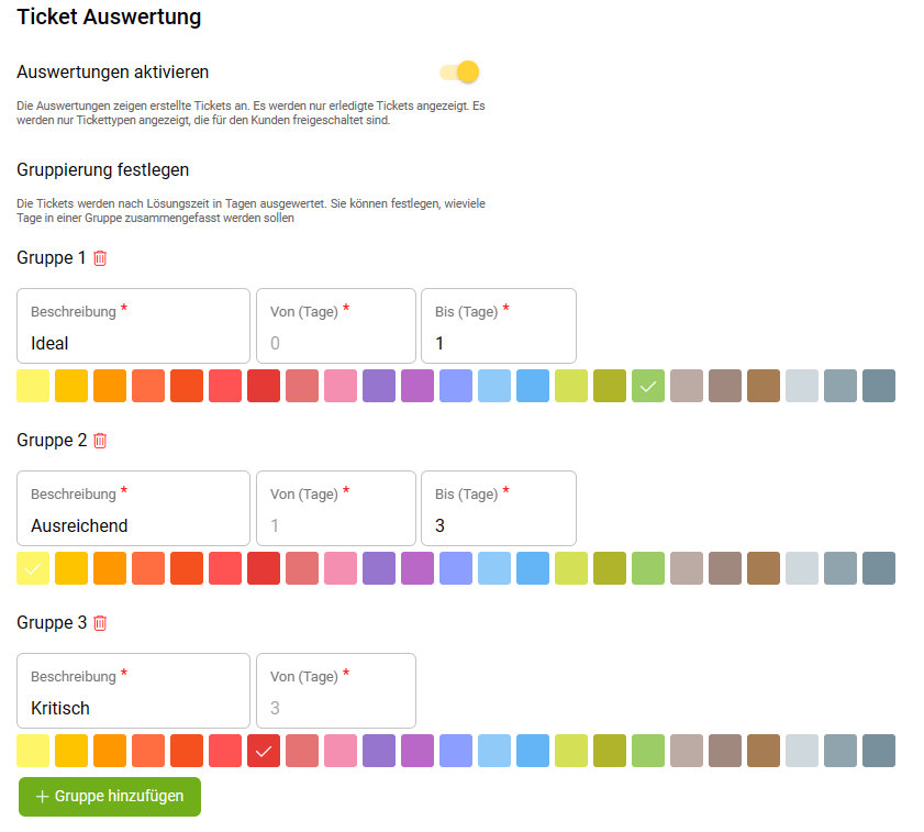 Ist dies aktiviert, sieht der Kunde in seinen Objekten unter “Auswertung” einen Bereich für erledigte Tickets. Es werden nur Tickettypen einbezogen, die für den Kunden freigeschaltet sind. Die Tickets werden nach Lösungszeit in Tagen ausgewertet. Über Gruppierungen legst du fest, wie viele Tage in einer Gruppe zusammengefasst werden sollen.
