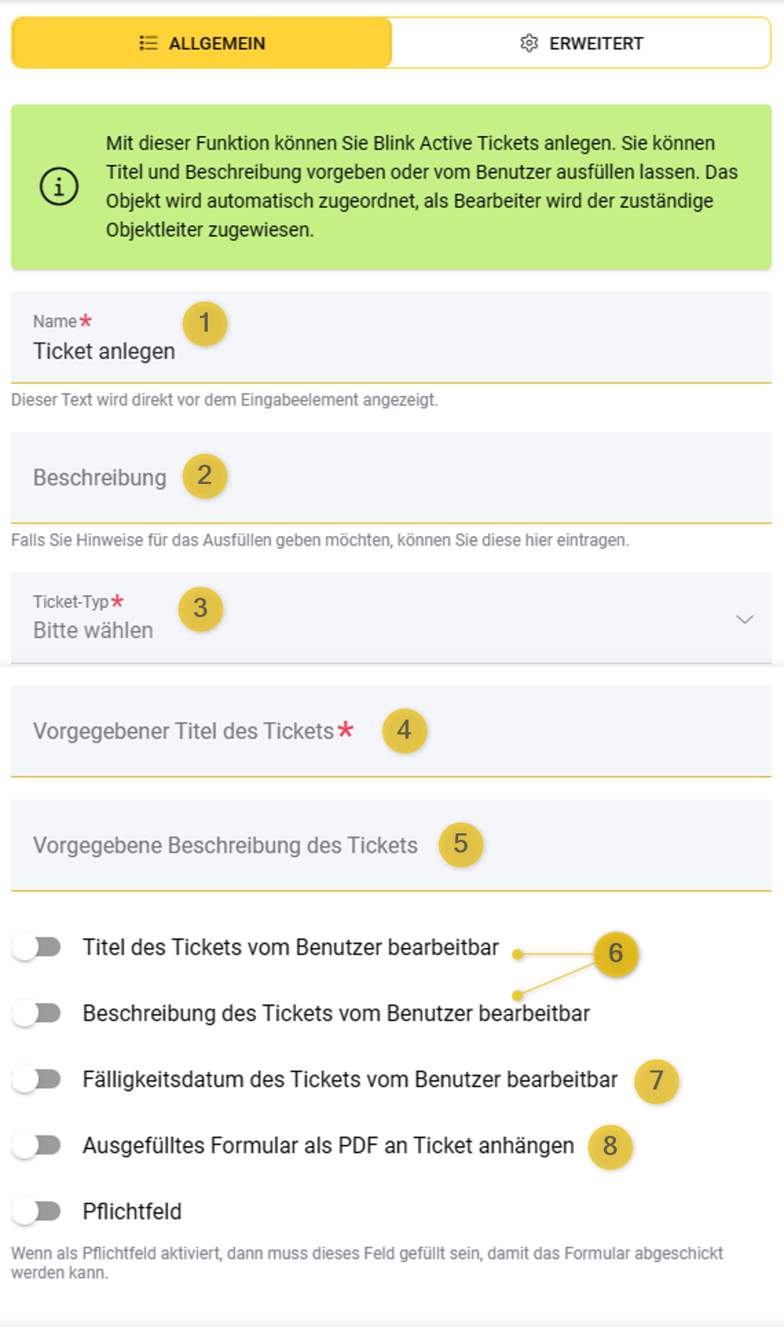 Gebe zunächst einen (1) Namen ein: Dieser wird als Text direkt vor dem Eingabeelement angezeigt. In der (2) Beschreibung kannst du z.B. Hinweise für das Ausfüllen eintragen. Wähle dann den (3) Ticket-Typen aus: Hier findest du alle Ticket-Typen außer Abwesenheitsanträge (z.B. Urlaub, Krankmeldung o.ä.). Der Tickettyp ist für den Ausfüllenden nicht veränderbar. Gib dann einen (4) Titel des Tickets, sowie optional eine (6) Beschreibung des Tickets vor. Du kannst im Anschluss einstellen, ob Titel und Beschreibung für den Benutzer, der das Formular ausfüllt, (6) bearbeitbar sind. Ansonsten wird das Ticket mit vorgegebenem Titel und ggf. Beschreibung erzeugt. Du kannst auch aktivieren, ob der Benutzer beim ausfüllen ein (7) Fälligkeitsdatum angeben kann und ob das (8) ausgefüllte Formular als PDF an das Ticket angehängt werden soll. Dies ist z.B. sinnvoll, wenn nach einer Objektbegehung eine Nachreinigung per Ticket veranlasst wird, an die das Protokoll der Begehung dann direkt angehängt ist.