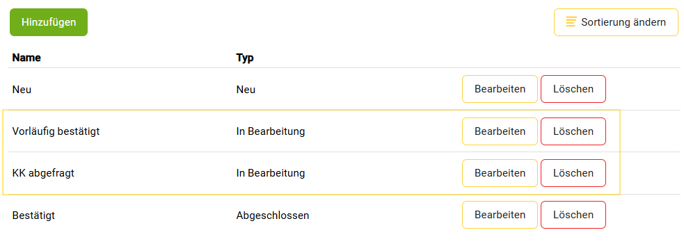 Zunächst müssen zwei weitere Statuswerte angelegt werden: der Status “Wartet auf Genehmigung” des Typs “In Bearbeitung” und der Status “Storniert” des Typs “Abgeschlossen”. Außerdem müssen die Action Key-Felder der Statuswerte angepasst werden: “Neu” und “Wartet auf Genehmigung” bekommen den Action Key “processing”, der Status “Storniert” bekommt den Action Key “complete”.