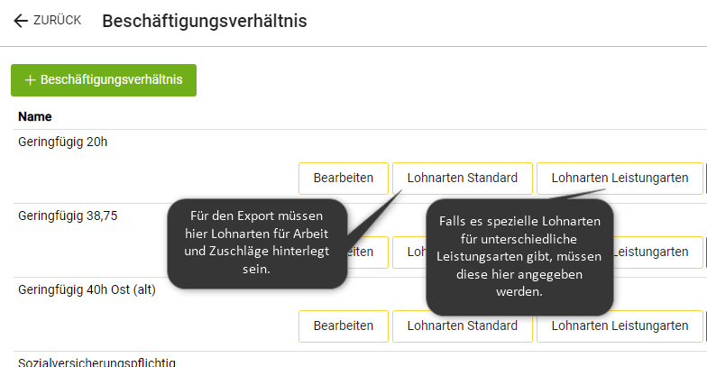 Die Lohnarten für Arbeit und Standard-Zuschläge (Nacht-, Feiertag- und Sonntagszuschlag) müssen in den Beschäftigungsverhältnissen (Konfiguration → Mandant) hinterlegt werden.