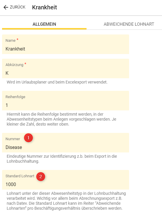 Bei den Standard-Abwesenheiten ist dies bereits befüllt. Bei eigenen Abwesenheitstypen können Sie diese Nummer frei vergeben.