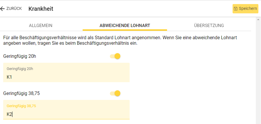 Lohnarten für Abwesenheitstypen die abhängig vom Beschäftigungsverhältnis sind, werden im Reiter “Abweichende Lohnart” eingetragen.