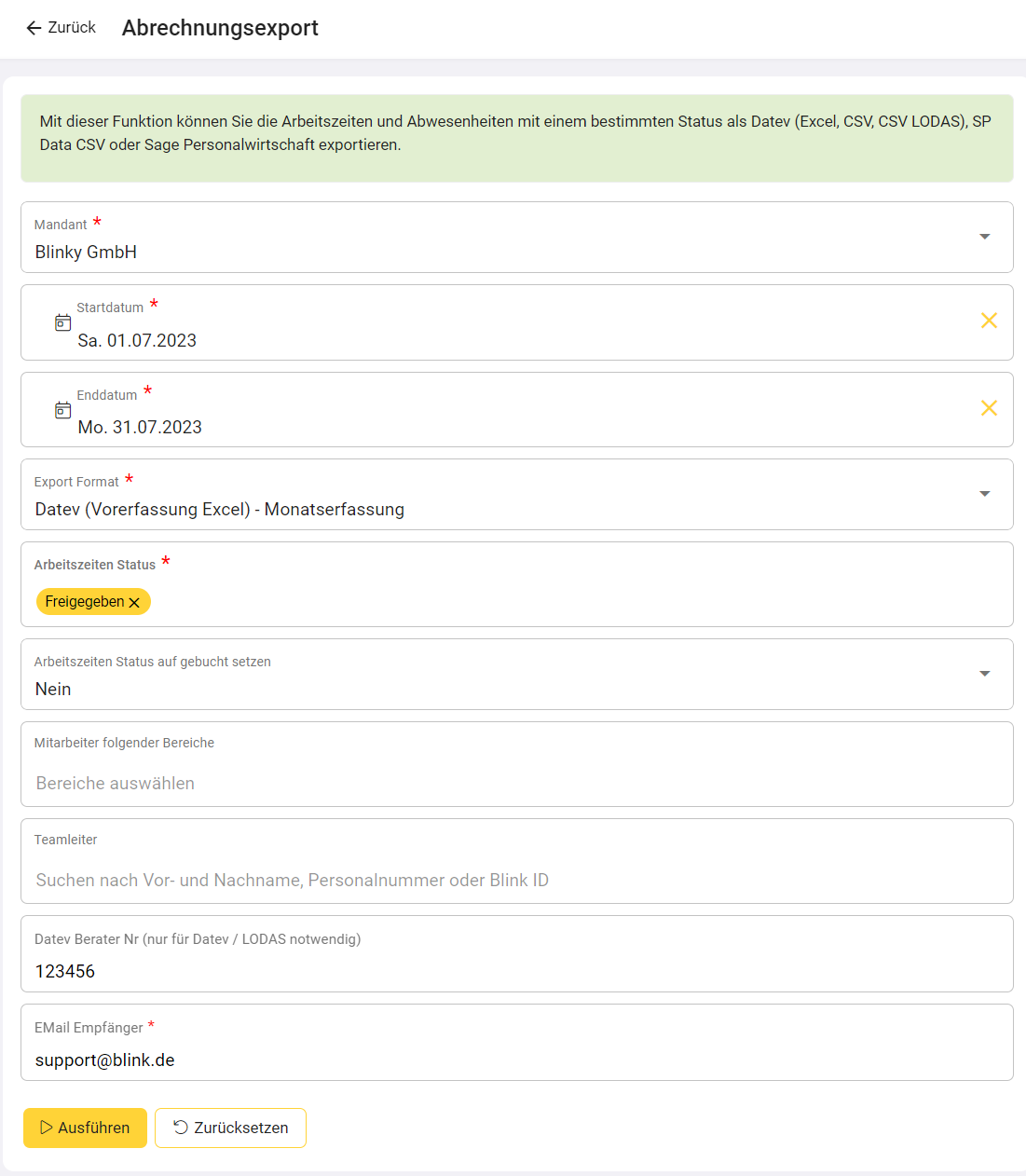 Der Abrechnungsexport ist ein Zusatzmodul für Blink Time. Wenn Sie Interesse an diesem Modul haben, dann wenden Sie sich bitte an den Vertrieb unter sales@blink.de .