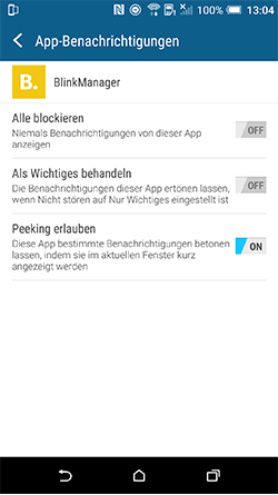 Unter Android können Sie unter Einstellungen > Apps > Blink Manager die Benachrichtigungen erlauben bzw. verbieten.