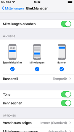 Beim ersten Start der App werden Sie explizit gefragt, ob Sie Benachrichtigungen erlauben möchten. Danach können Sie diese Einstellung manuell ändern unter Einstellungen > Mitteilungen > Blink Manager