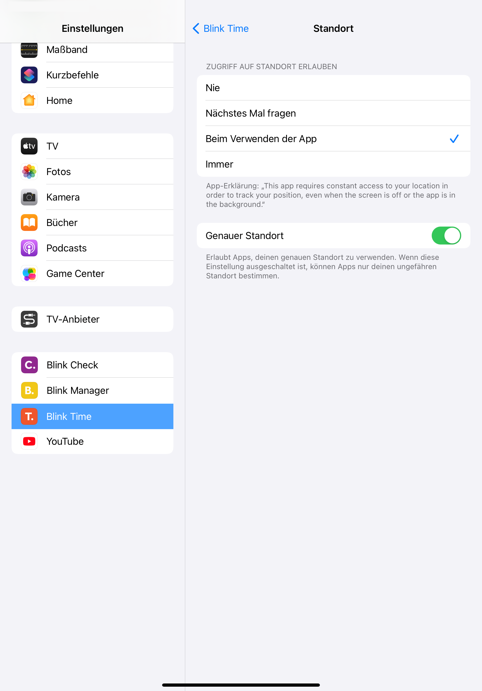Unter iOS finden Sie die Einstellungen für die App-Berechtigungen und für die Genauigkeit unter "Einstellungen" > "Blink Time" > "Standort"