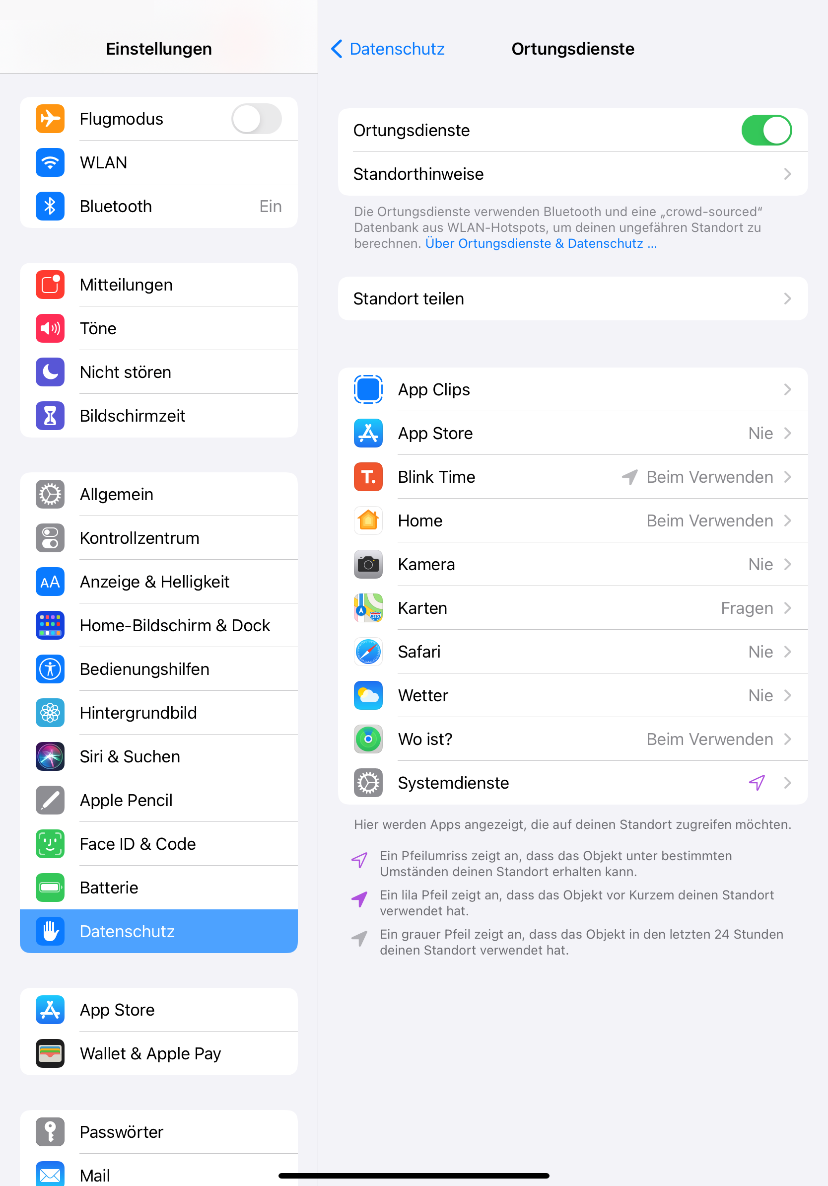 Unter iOS finden Sie die Einstellungen zum Aktivieren unter "Einstellungen" > "Datenschutz" > "Ortungsdienste"
