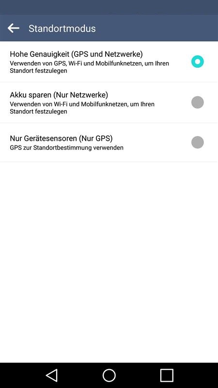 Unter Android finden Sie die Einstellungen zum Aktivieren und für die Genauigkeit unter "Einstellungen" > "Allgemein" > "Standort" > "Modus"