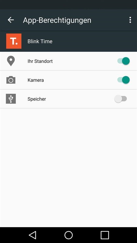 Unter Android finden Sie die Einstellungen für die App-Berechtigungen unter "Einstellungen" > "Allgemein" > "Apps" > "Blink Time" > "Berechtigungen"