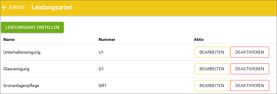 Leistungsarten werden pro Mandant festgelegt. Beispiele für Leistungsarten können sein: Unterhaltsreinigung, Glasreinigung oder Winterdienst.