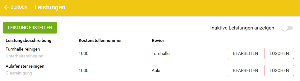 Leistungen werden pro Objekt definiert. Leistungen werden immer mit einer Leistungsart verknüpft und können noch zusätzliche Daten enthalten wie Auftragsnummer oder Revier. Beispiele für Leistungen: Reinigung Etage 1, Alle Fenster reinigen, Grünanlage im Hof