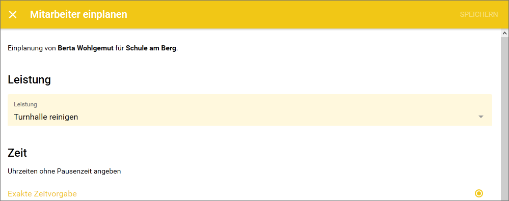 Pro Objekt kann eine Leistung als “Standard” Leistung definiert werden. Wenn eine Zeit erfasst wird und es keine passende Planung gibt, dann wird dieser Arbeitszeit automatisch die Standardleistung zugewiesen.