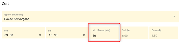Wenn ein Mitarbeiter Zeiten erfasst, die sich mit der Planung überschneiden, dann wird die hier definierte Pause automatisch von der Arbeitszeit abgezogen (im Beispiel 30 Minuten). Die Pause wird immer abgezogen, egal ob der Mitarbeiter kürzer oder länger als geplant arbeitet.
