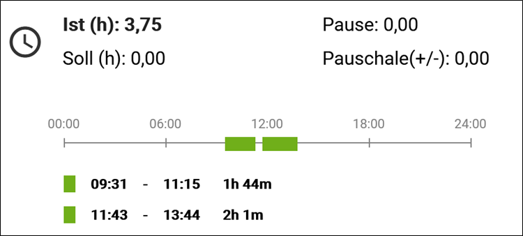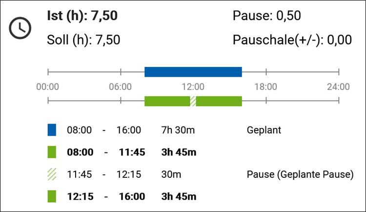 Da die Pause automatisch von der gearbeiteten Zeit abgezogen wird, kann die Lage nur geschätzt werden. Die Pausenlage wird in der Detailansicht der Arbeitszeit ausgewiesen (es wird die "Mitte" der Arbeitszeit für die gemachte Pause angenommen).