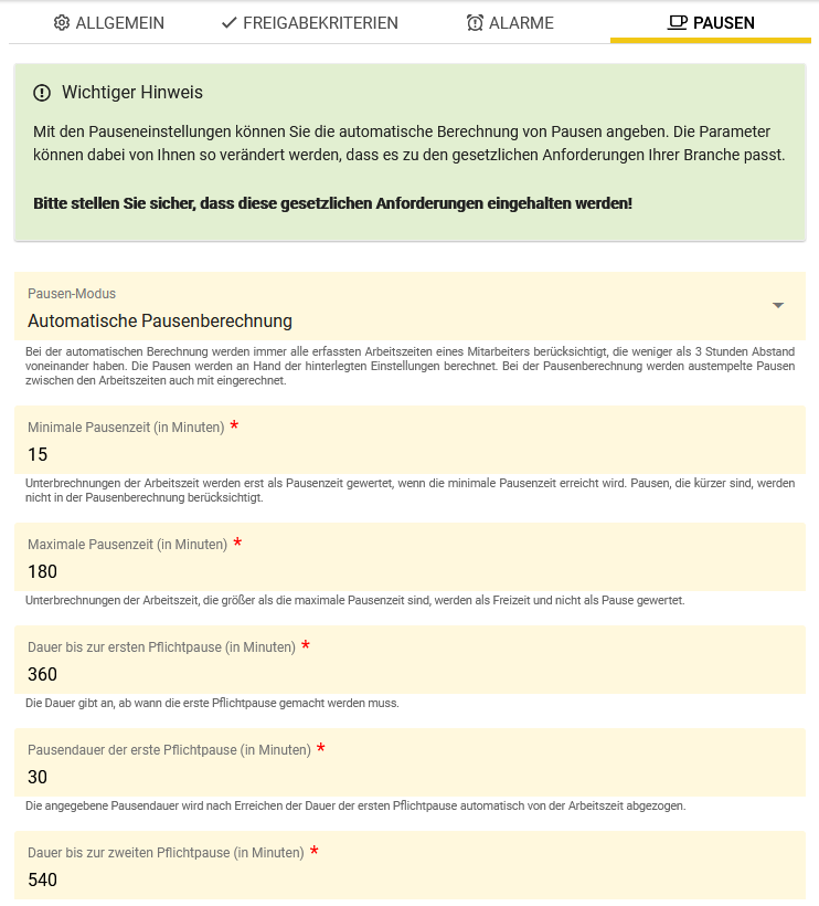 Die Pause wird auf Basis dieser Einstellungen berechnet: