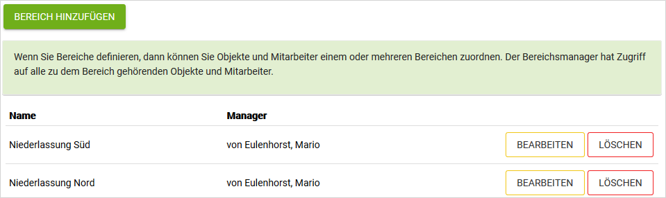 Die Bereiche stellen eine zusätzliche Möglichkeit dar, in größeren Unternehmen Organisationsstrukturen zu definieren. Mitarbeiter und Objekte können Bereichen zugeordnet werden. Der Bereichs-Manager kann diese Mitarbeiter und Objekte dann sehen und bearbeiten. Auf diese Art und Weise können z.B. Niederlassungsleiter oder Geschäftsbereichsleiter in Blink hinterlegt werden.