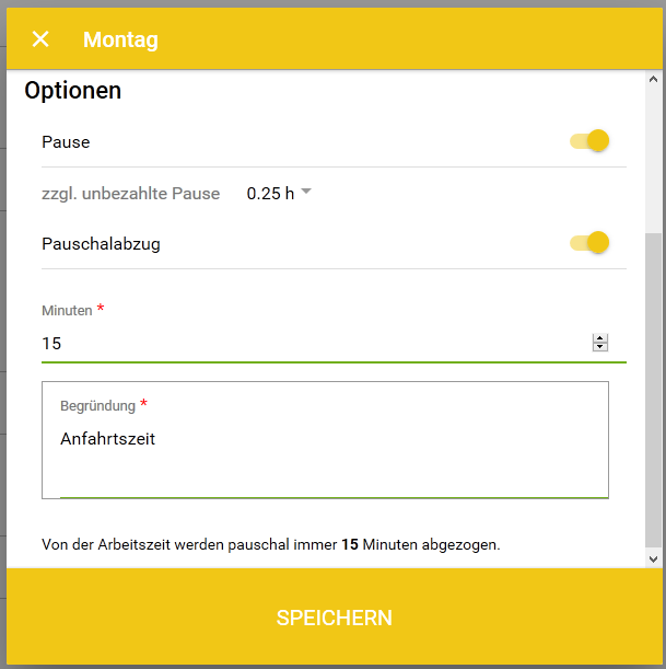 - Beim Bearbeiten einer Arbeitszeit können Pause und Pauschalabzug auch nachträglich geändert werden