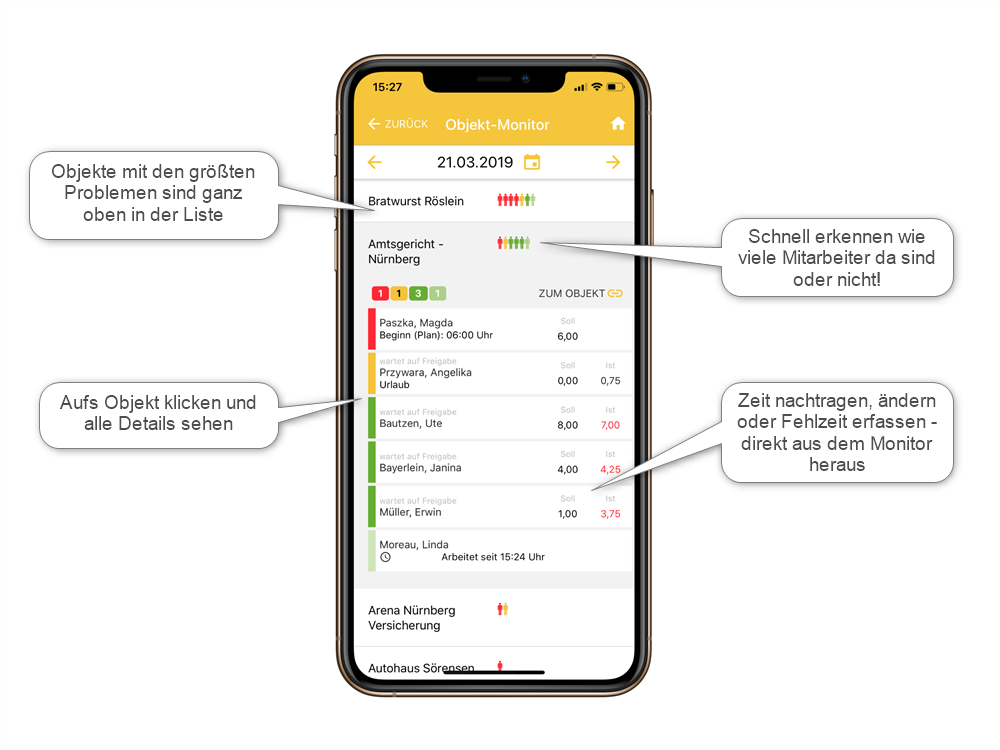 Der bisherige Objekt Monitor (vorher Standort Monitor) hatte bereits die Anwesenheiten nach Objekt gruppiert. Jetzt haben wir diese Ansicht noch besser gemacht. Pro Objekt werden Symbole angezeigt, wieviele Mitarbeiter anwesend sind oder nicht. Die Liste der Objekte wird nach Anzahl der "Probleme" sortiert. So sind die größten Problemfälle immer oben in der Liste. Schneller kann man sich keinen Überblick verschaffen!