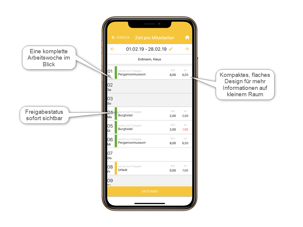 Die neue kompakte Ansicht von Zeiten bringt mehr Übersicht auf kleine Bildschirme! Gleiche Information auf weniger Raum. Die neue Ansicht wurde auf allen Seiten der App umgesetzt.