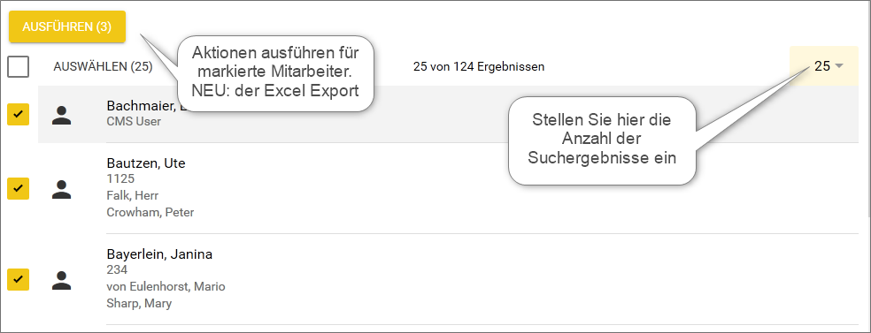 Sie können Suchergebnisse direkt als Excel exportieren. Dazu haben wir eine neue Aktion eingeführt, die Sie ausführen können, wenn Sie in der Ergebnisliste einen oder mehrere Ergebnisse markieren.
