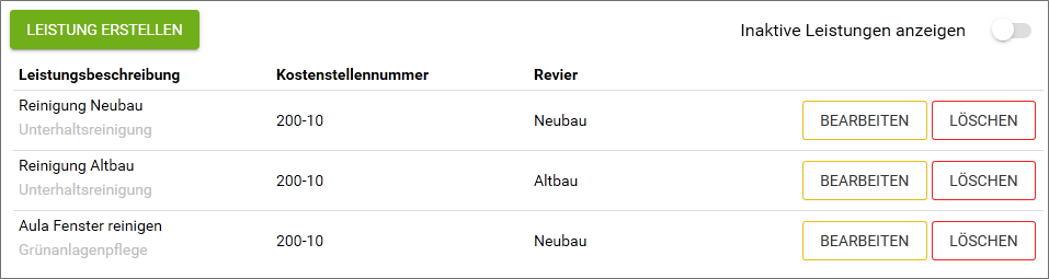 Definieren Sie beliebige Leistungen pro Objekt und ordnen Sie den Leistungen Auftragsnummer, Kostenstelle und Revier zu.