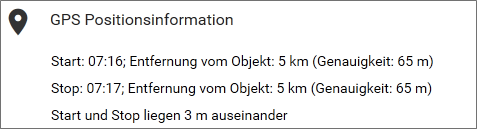 Wenn es bei einer erfassten Zeit zu einem GPS Alarm kommt, werden die detaillierten GPS Daten im unteren Bereich der Arbeitszeit mit angezeigt. Damit ist eine Einschätzung, wie weit der Mitarbeiter vom Objekt entfernt war, besser möglich.