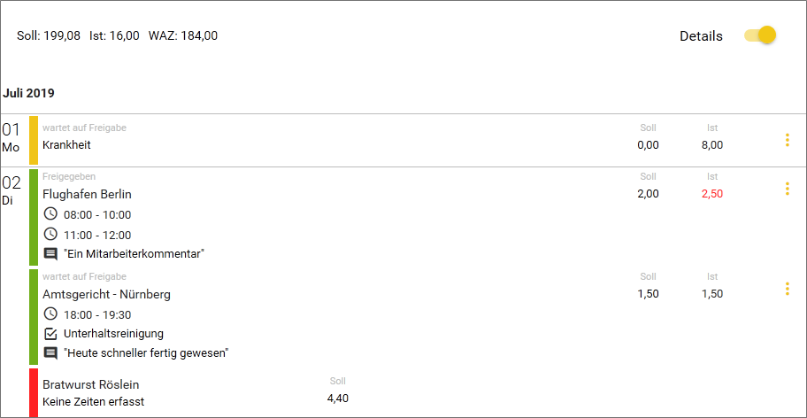 Eine oft gewünschte Forderung: Mehr Informationen bereits in den Listen anzeigen, damit man schneller entscheiden kann, ob eine Arbeitszeit korrekt erfasst wurde.