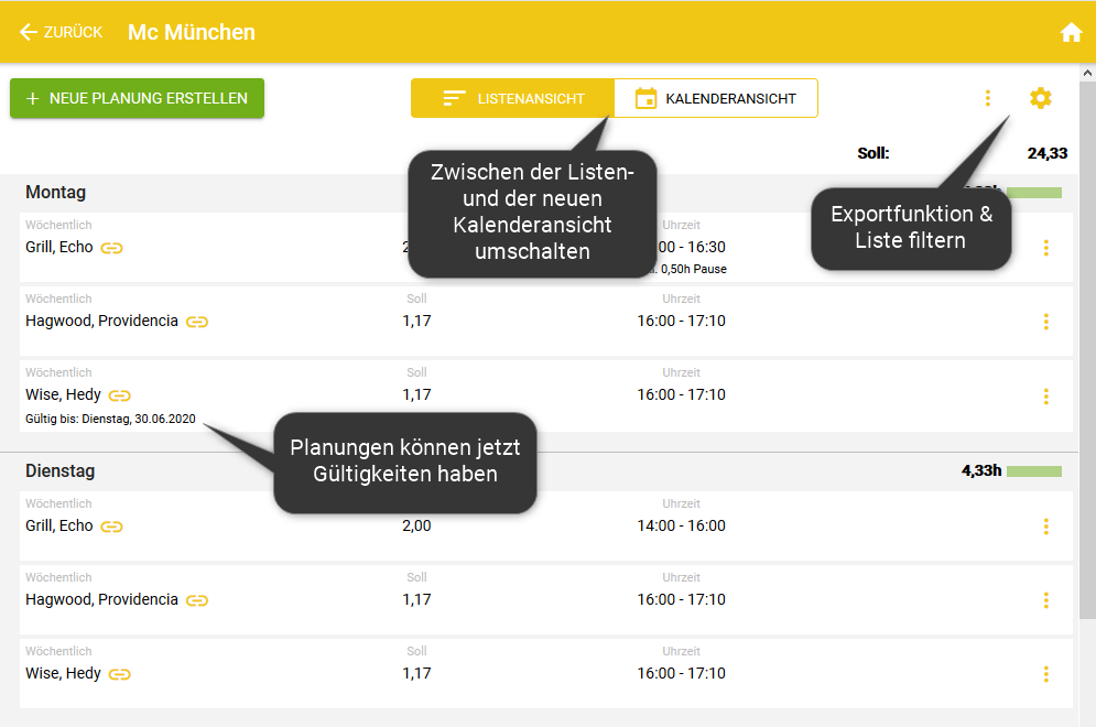 Die neuen Funktionen sind natürlich auch in der Listenansicht schon sichtbar. Hier können Planungen auch nach Gültigkeit gefiltert werden, so dass Planungen der Vergangenheit nicht angezeigt werden.