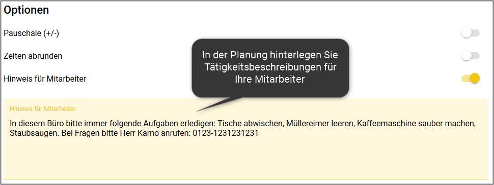 Sie können in jeder Planung individuell für jeden Mitarbeiter eigene Hinweise hinterlegen. So können Sie beispielsweise die Tätigkeiten des Leistungsverzeichnisses direkt in der Planung hinterlegen.