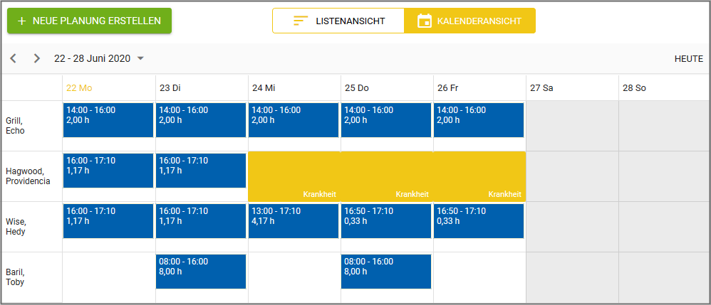Die neue Kalenderansicht zeigt die Einplanung der Mitarbeiter übersichtlich als Kalender. Hier kann man auch sofort erkennen, wenn es auf Grund von Abwesenheiten zu Konflikten kommt.