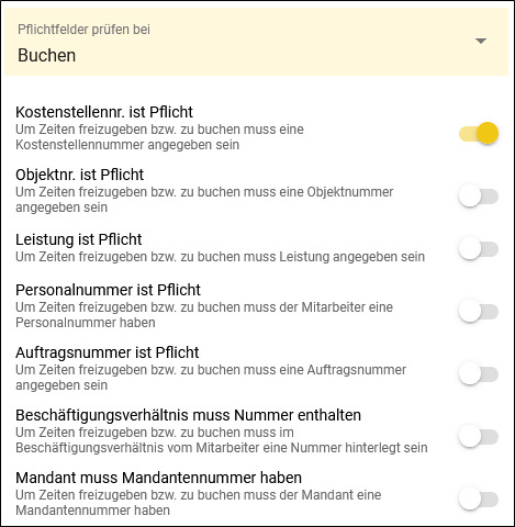 Der Freigabeprozess in Blink spielt eine wichtige Rolle, um die Qualität der erfassten Zeiten zu prüfen, zu korrigieren und für die Weiterverarbeitung in der Lohnbuchhaltung freizugeben. Je nach ERP System sind die Anforderungen an die Daten unterschiedlich. Damit im Zielsystem die korrekten Informationen ankommen können Sie den Freigabeprozess so steuern, dass bestimmte Angaben Pflicht sind. Folgende Daten können automatisch auf Existenz pro Zeiteintrag geprüft werden: