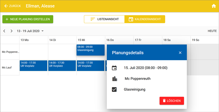 In der Einplanung können Sie sich die Planung eines Mitarbeiters in einer grafischen Ansicht anzeigen lassen. Hier können Sie auch einmalige Planungen direkt löschen.