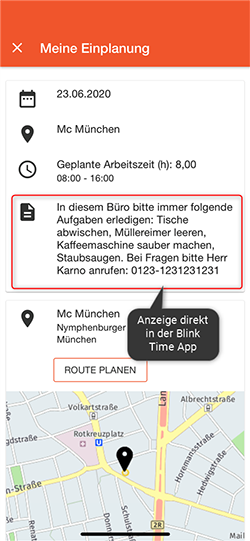 Diese Hinweise werden den Mitarbeitern in der Blink Time App angezeigt, wenn sie auf einen Planungseintrag klicken!