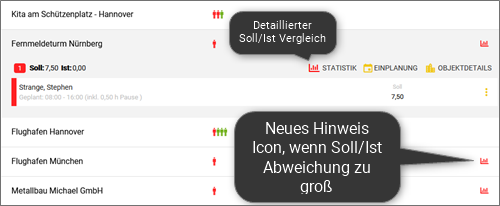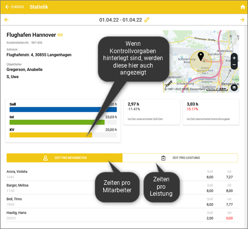 Über den Monitor oder über die Objektdetailseite kann die neue Statistik aufgerufen werden. Hier wird nicht nur der aktuelle Soll/Ist Vergleich angezeigt, sondern auch die Summe pro Mitarbeiter bzw. pro Leistungsart.