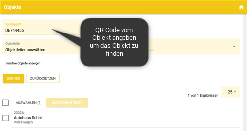 In der Objektsuche und in der Suche auf der Startseite kann jetzt auch nach Objekt QR Code gesucht werden. Wenn Sie also einen QR Code finden und nicht wissen zu welchem Objekt der gehört, dann können Sie jetzt einfach danach suchen.