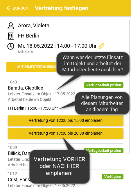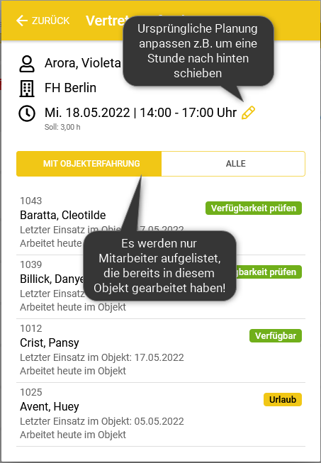 - Die Mitarbeiter, die an dem Tag der Vertretung bereits im Objekt arbeiten werden als erstes angezeigt.