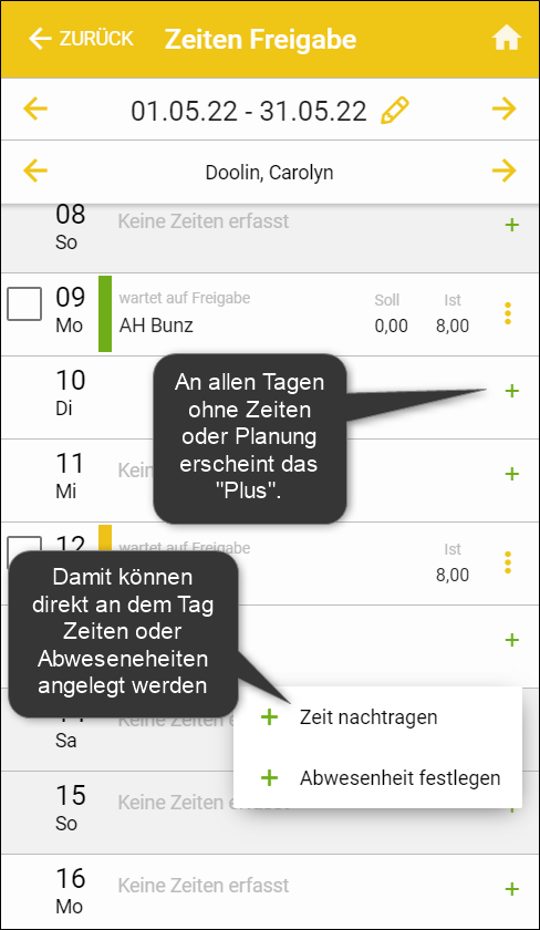 In der Zeiten Freigabe und in den Gebuchten Zeiten von Mitarbeitern und Objekten erscheinen "Plus" Symbole an allen Tagen, an denen keine Planung oder Arbeitszeit vorhanden ist. So kann mit wenigen Klicks für diese Tage eine Abwesenheit oder Arbeitszeit nachgetragen werden.