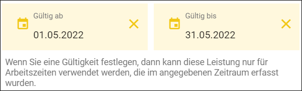 Leistungen von Objekten können optional mit einer Gültigkeit versehen werden. Wenn eine Gültigkeit hinterlegt wird, dann kann die Leistung nur für Arbeitszeiten verwendet werden, die im Gültigkeitszeitraum liegen. Zusätzlich gibt es ein Notizenfeld in den Leistungen. Hier können zusätzliche Informationen hinterlegt werden, die dann auch bei der Auswahl einer Leistung angezeigt werden.