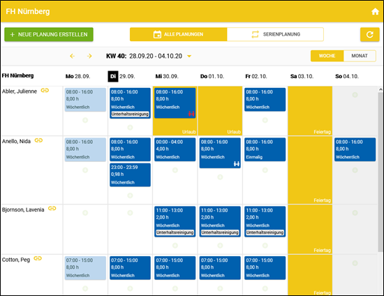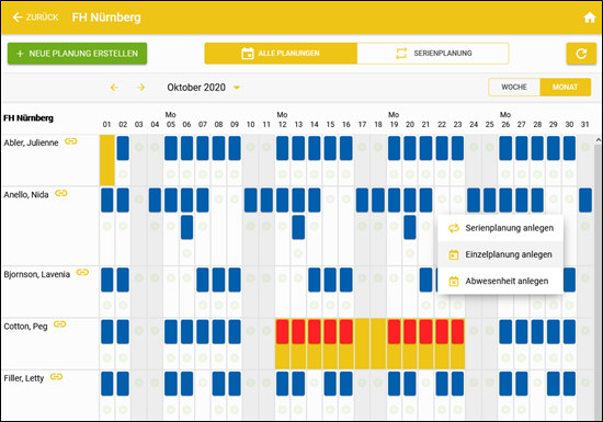 In der Monatsansicht erkennen Sie auf einen Blick, wo Sie Probleme in der Planung bekommen werden. Mit Klick auf einen Planungseintrag können Sie die gleichen Funktionen, wie in der Wochenansicht nutzen. Gerade für die langfristige Planung oder für Urlaubsplanungen ist diese Ansicht ideal!