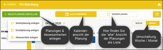 Die bisherige Funktion der "Einzelplanung" haben wir etwas sichtbarer gemacht. In der Einplanung können Sie jetzt direkt eine Einzelplanung oder Serienplanung anlegen. Wenn Sie im Kalender auf ein "+" Symbol in einer Zelle klicken, dann sind auch gleich alle Felder vorausgefüllt. So einfach legen Sie neue Planungen an!