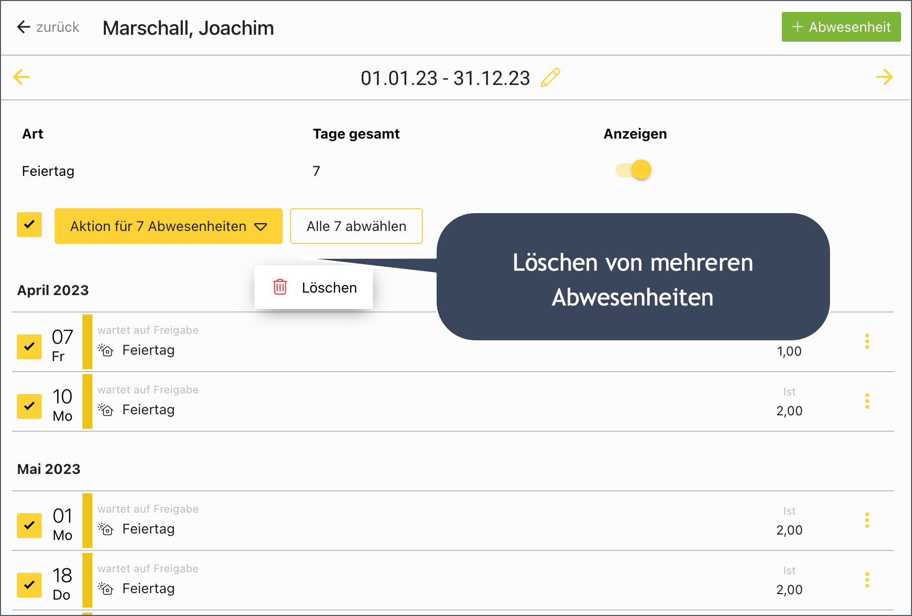 In Mitarbeiter → Abwesenheiten können Sie die neue Massenoperation nutzen um mehrere Abwesenheiten auf einmal zu löschen.