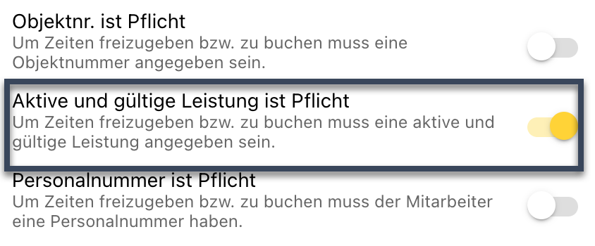 Bei der Freigabe von Zeiten kann in den Einstellungen festgelegt werden, dass nur aktive Leistungen an Zeiten erlaubt sind. Zusätzlich wird mit dieser Einstellung jetzt auch geprüft, ob die Leistung gültig ist (ob also der Zeitraum der Leistung auch zum Datum der Arbeitszeit passt).
