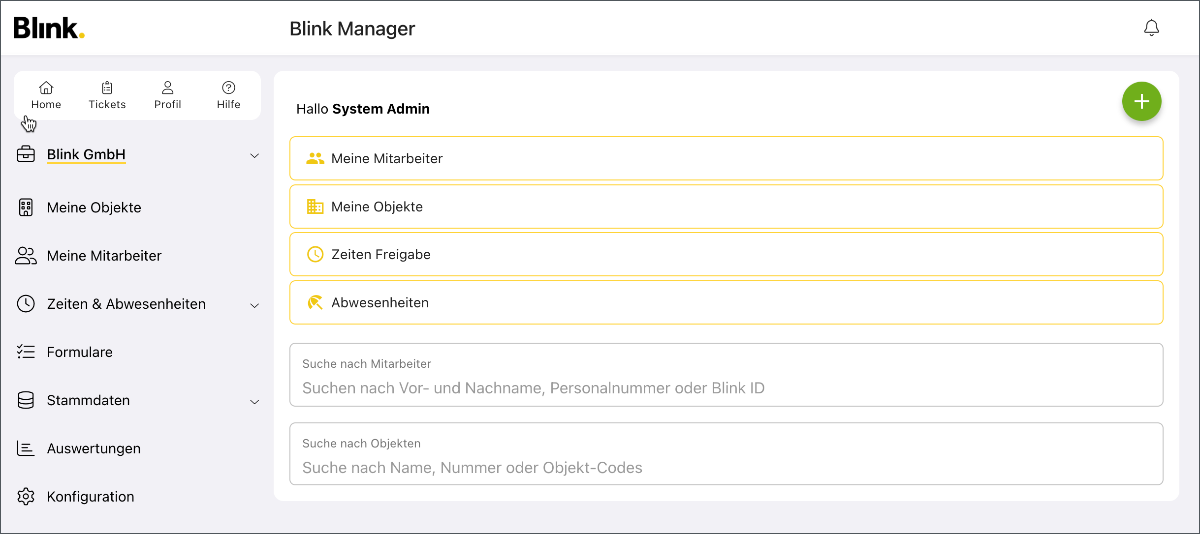 Über den Menüpunkt “Formulare” springt man direkt in Blink Check. Der Menüpunkt wird natürlich nur angezeigt, wenn das Modul aktiv ist und der angemeldete Benutzer Berechtigungen auf Blink Check hat.