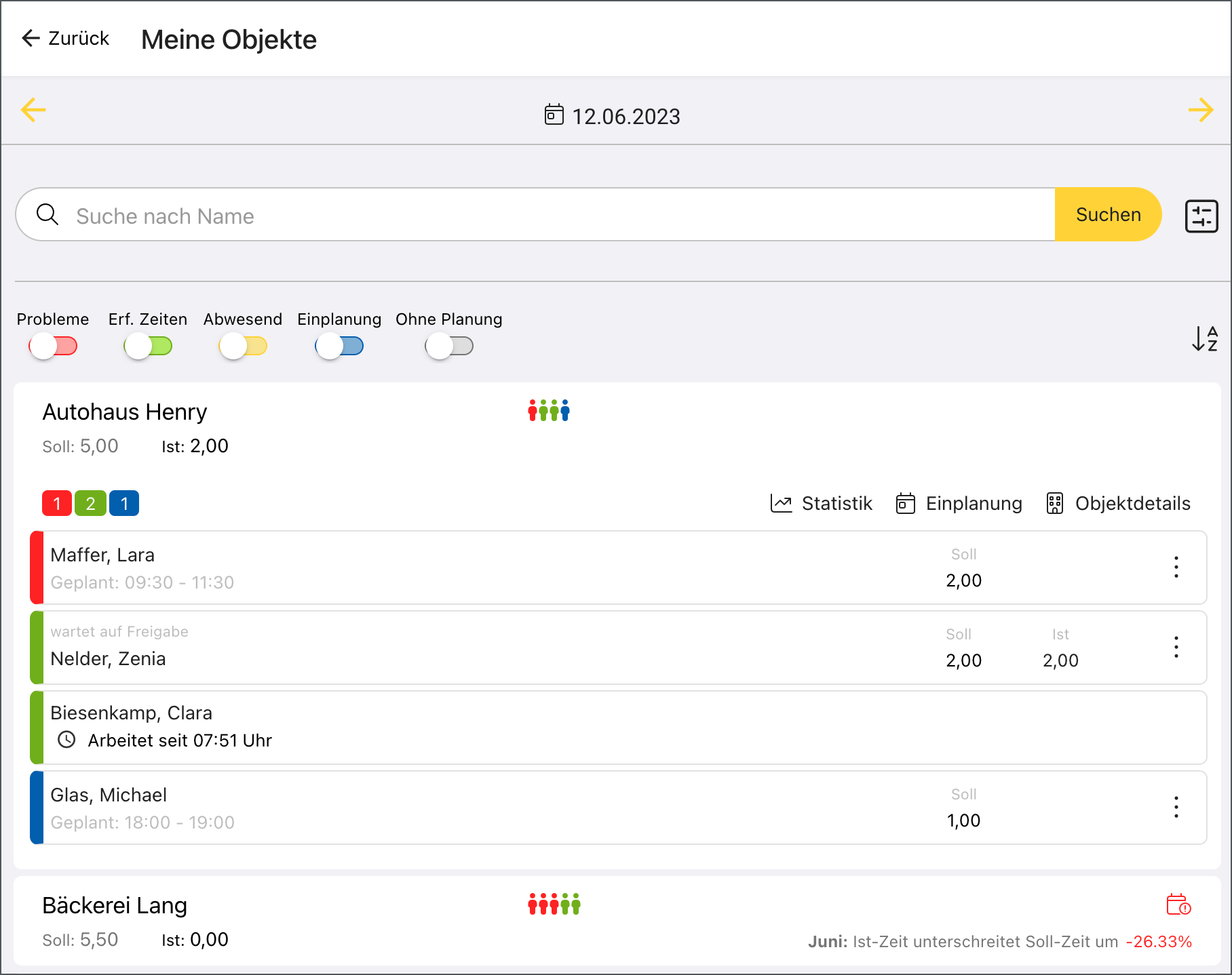 Wir haben unser Layout nochmal verbessert: Die Lesbarkeit der gesamten App wurde optimiert durch die Einführung eines grauen Hintergrunds. Damit unterscheidet sich der Inhalt klar von der Navigation. Suche nach Mitarbeitern und Objekten wurde um grafische Elemente ergänzt.