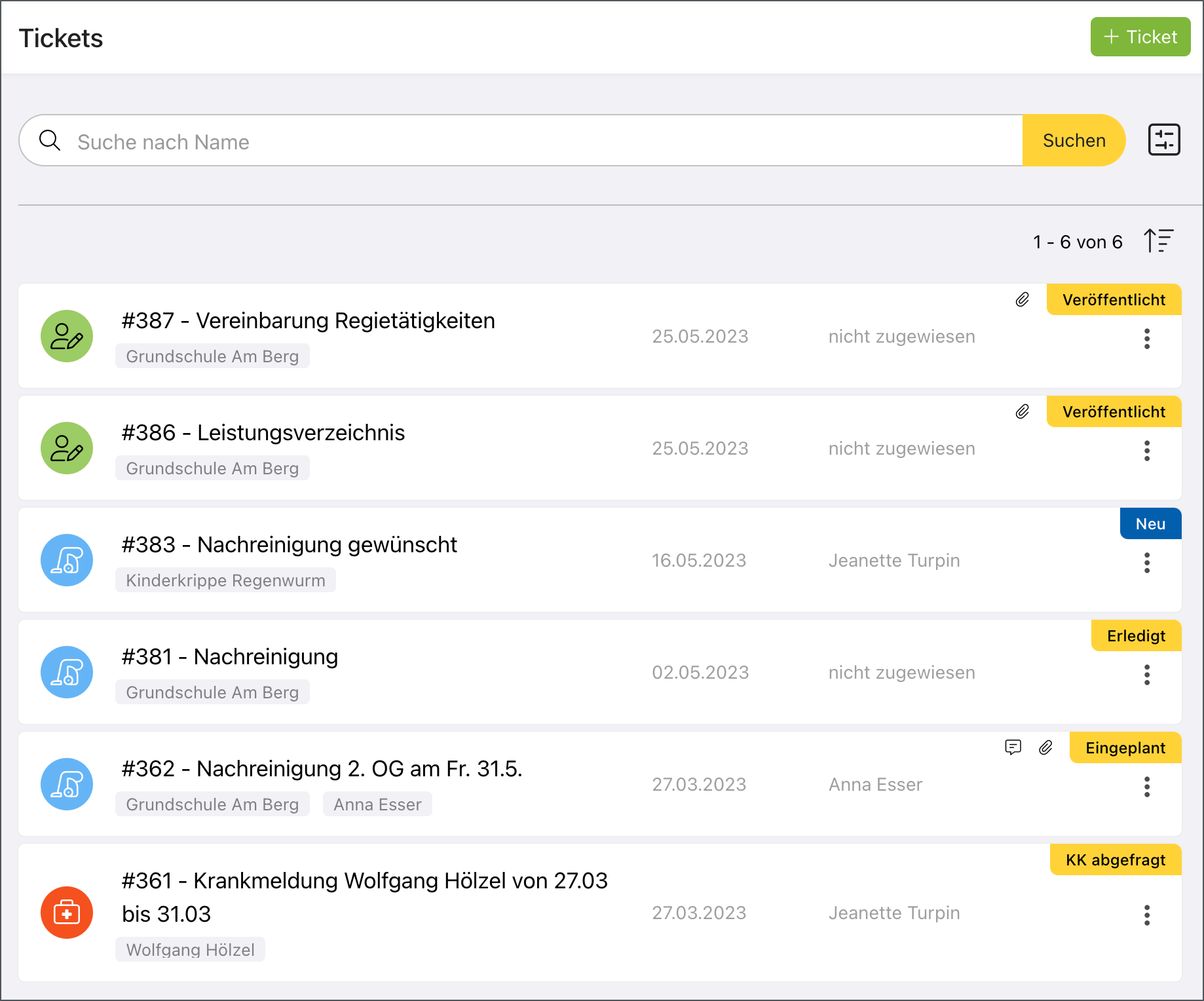 Die Ticketliste ist auch im neuen Layout gestaltet und bietet jetzt mehr Funktionen bei Suche und Filterung.