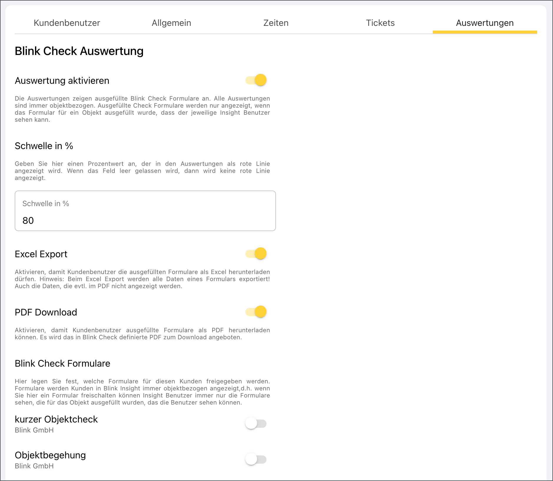 Blink Insight kann ab sofort auch ausgefüllte Formulare von Blink Check als Auswertung anzeigen. Die Konfiguration von den Insight Kunden wurde um einen neuen Punkt erweitert, über den man die Auswertungen konfigurieren kann.