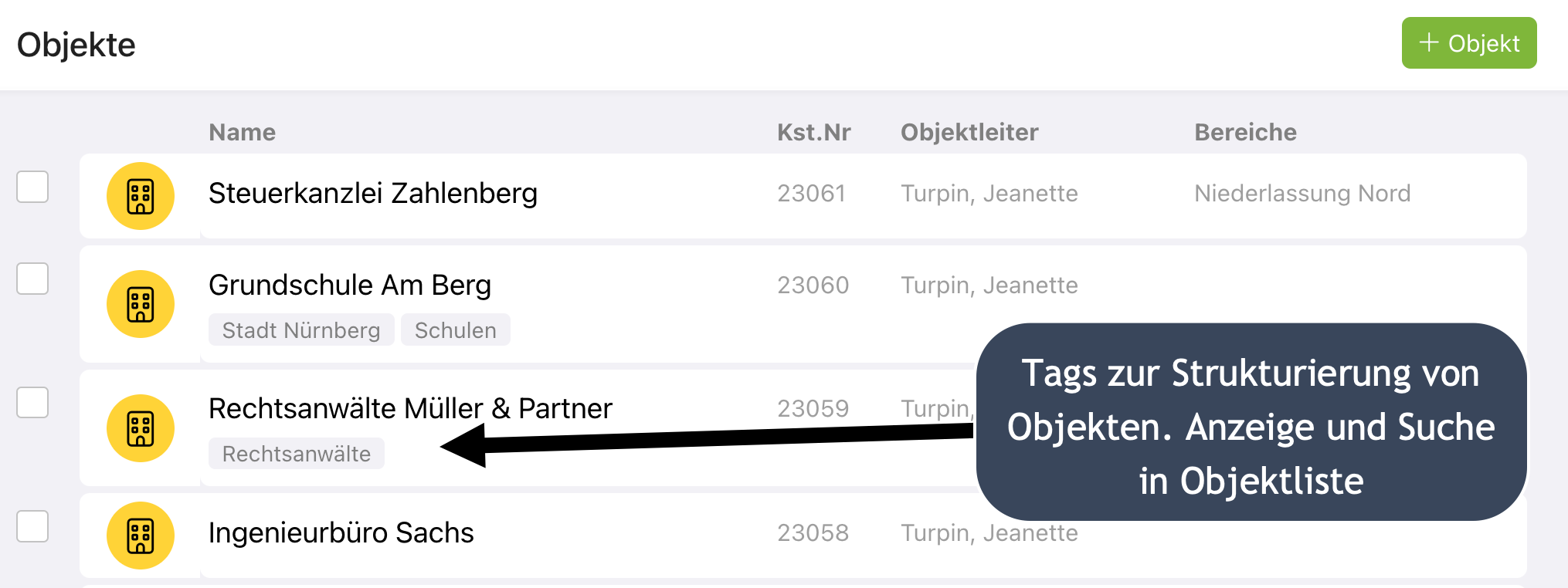 Mit Tags strukturieren Sie Ihre Objekte z.B. nach Themen oder Klassifizierungen. Wichtig: Tags werden auch im Kundenportal Blink Insight angezeigt. Nutzen Sie also nur sinnvolle Tags, die auch Ihre Kunden sehen dürfen. Wenn ein Kunde sehr viele kleine Objekte hat z.B. Toiletten, dann kann mit den Tags in Blink Insight eine gruppierte Ansicht angezeigt werden.