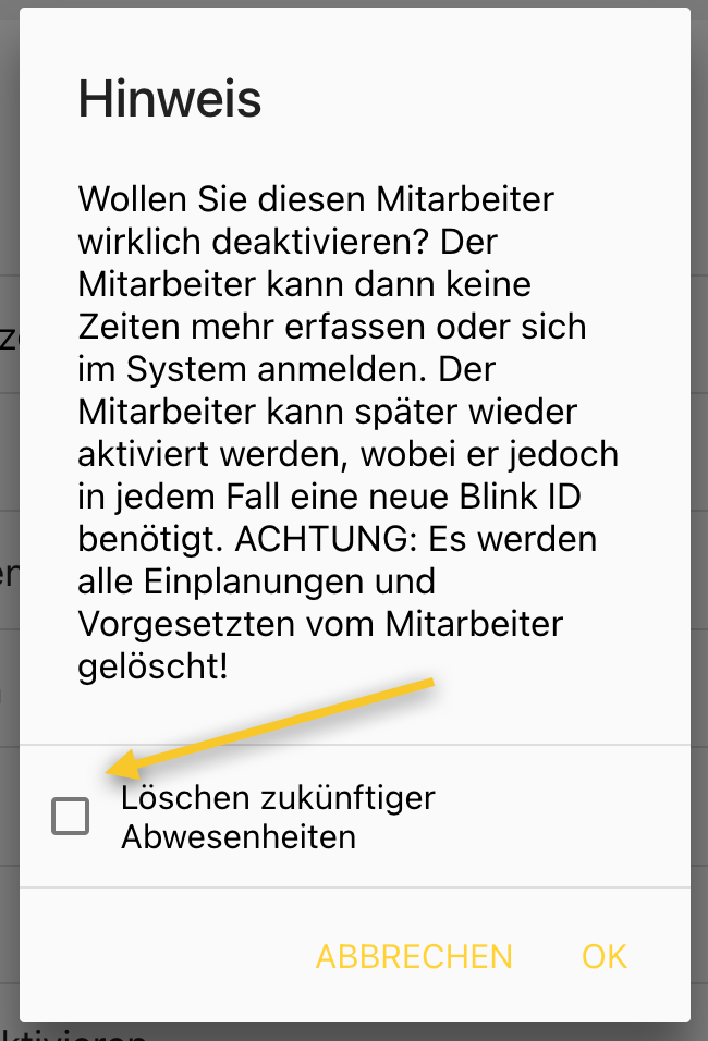 Beim Deaktivieren von Mitarbeitern kann man jetzt entscheiden, ob zukünftige Abwesenheiten automatisch aus Blink gelöscht werden sollen.