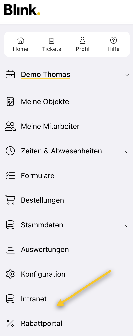 Mit den externen Links können Sie Ihre eigenen internen Systeme mit Blink verknüpfen. In der Konfiguration können pro Mandant beliebige Links hinterlegt werden. Pro Link kann definiert werden, welche Berechtigungsgruppe diesen Link sehen darf. Die Links werden auch in der zukünftigen Blink me App für Reinigungskräfte angezeigt.